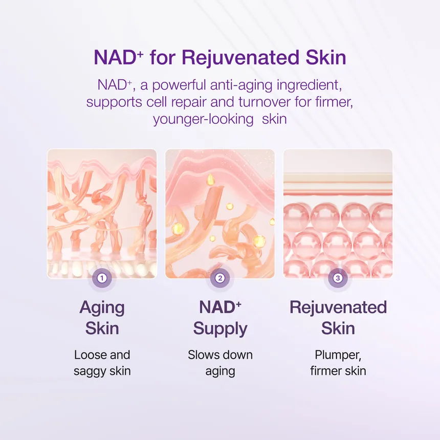 - NAD+ (نیکوتین آمید آدنین دی نوکلئوتید): یک کوآنزیم حیاتی که در سطح سلولی عمل میکند. NAD+ در فرآیندهای متابولیک و تولید انرژی سلولی نقش دارد و به ترمیم DNA آسیبدیده کمک میکند. افزایش سطح NAD+ در پوست میتواند به بهبود عملکرد سلولها، افزایش طول عمر آنها و محافظت در برابر آسیبهای ناشی از عوامل محیطی منجر شود. این امر به نوبه خود، به حفظ جوانی و شادابی پوست کمک میکند.