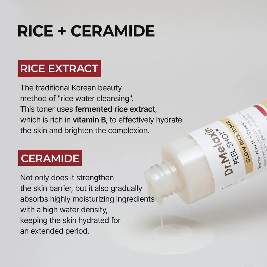 🔬 ترکیبات کلیدی و مکانیسم عمل تونر پیلینگ شات برنج سفید دکتر ملاکسین (Dr.Melaxin Peel Shot Glow Rice Toner)