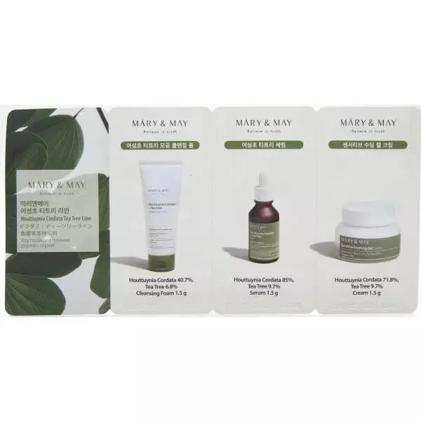 ساشه مراقبت از پوست مری اند می “Mary&May Houttuynia TeaTree Line 3 Step” یک کیت مراقبتی متمرکز است که توسط برند کره‌ای Mary&May برای پوست‌های مستعد آکنه، چرب و حساس که نیاز به تسکین، کنترل چربی و مراقبت از منافذ دارند، طراحی شده است.