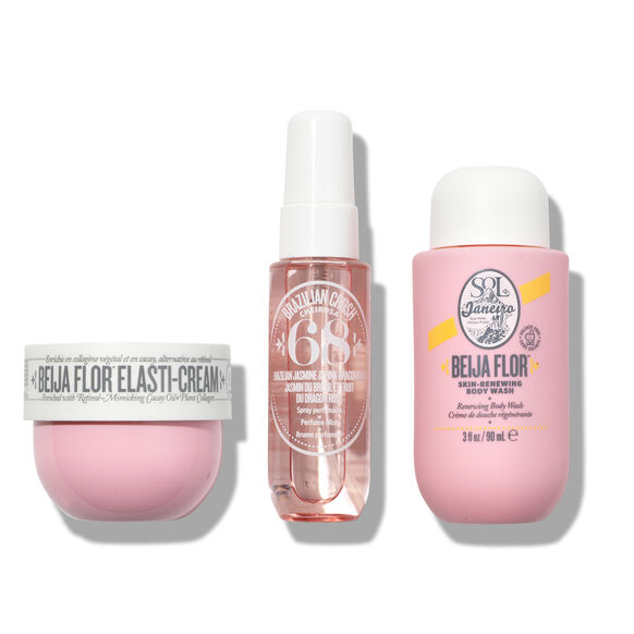ست جوانساز سول دی ژانیرو “Sol de Janeiro Beija Flor Jet Set” یک مجموعه مسافرتی و محبوب از محصولات مراقبت از بدن از برند سول دی ژانیرو است که توسط برند برزیلی Sol de Janeiro ارائه شده است. نام “Beija Flor” در پرتغالی به معنای “مرغ مگسخوار” است که نماد زیبایی، چابکی و شادی است. ست جوانساز سول دی ژانیرو بر روی افزایش خاصیت ارتجاعی و سفتی پوست (Elasti-Cream)، آبرسانی، و تغذیه پوست با هدف داشتن پوستی پُر و باطراوت تمرکز دارد و با رایحه گلی و میوهای Cheirosa ’68 معطر شده است.