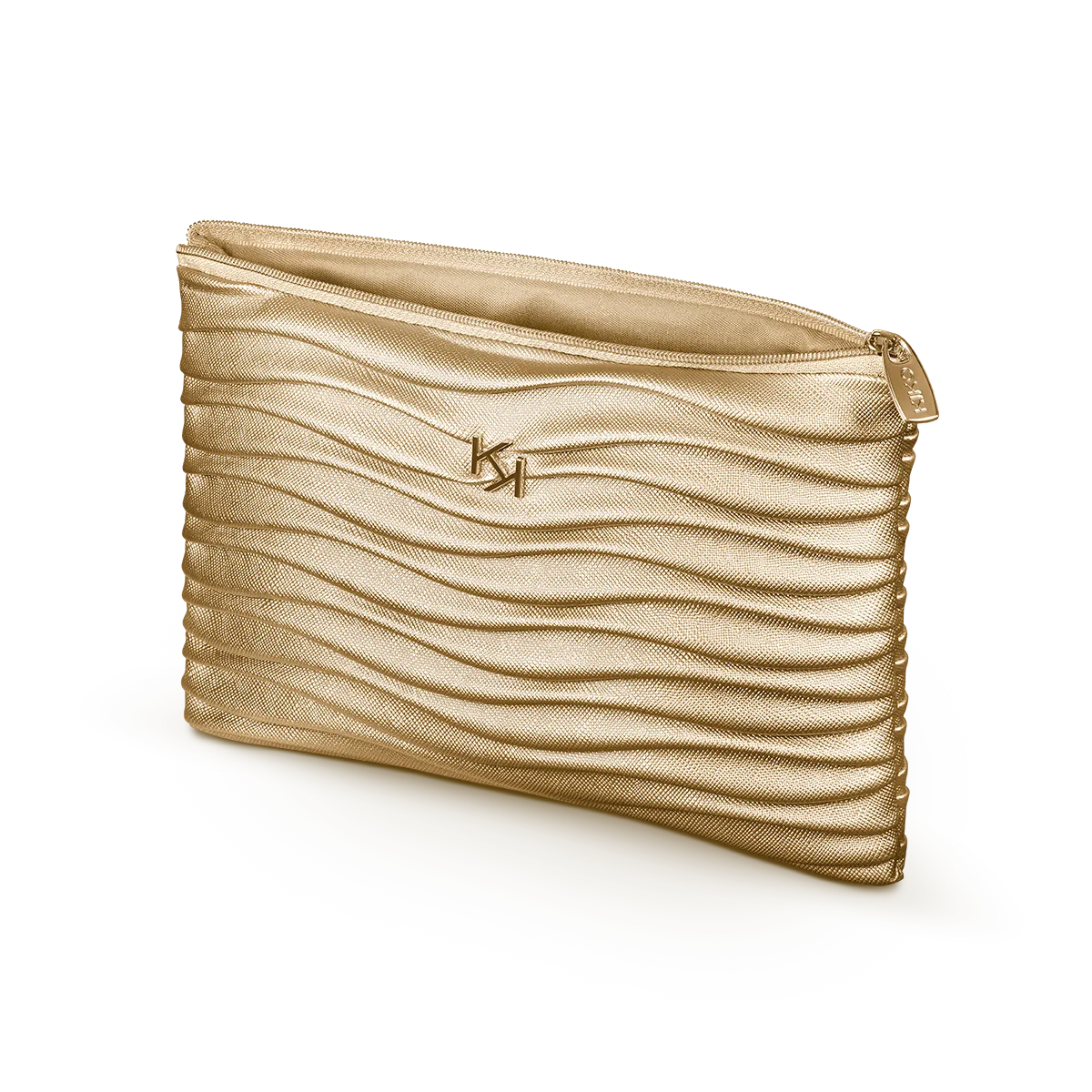 بستهبندی لوکس و کاربردی: محصولات در یک کیف زیبای طلایی رنگ (Gold Pouch) ارائه میشوند که نه تنها ظاهری جذاب و ایدهآل برای هدیه دارد، بلکه برای حمل و نگهداری محصولات آرایشی نیز بسیار کاربردی است.