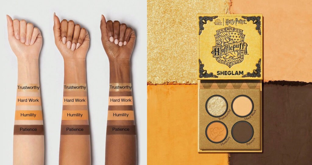 2)پالت سایه Hufflepuff شامل چهار رنگ سایه با رنگ های: Trustworthy (طلایی روشن گلیتری)، Hard Work (هلویی روشن مات)، Humility (اُکر مات)، Courage (قهوی ای تیره مات)
