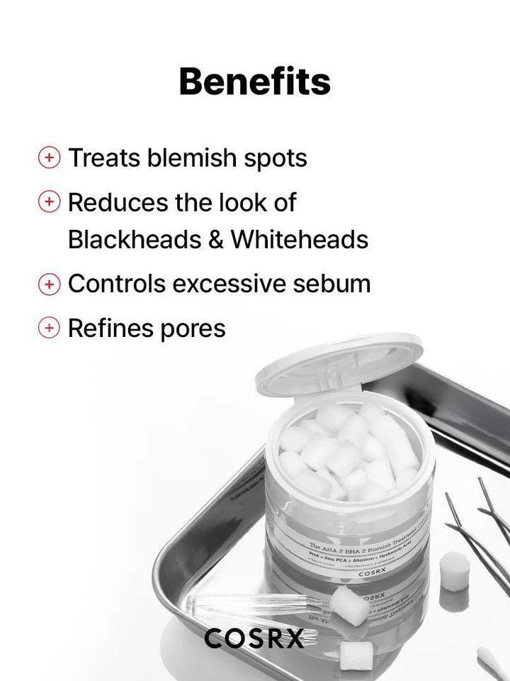 پد درمانی AHA BHA کوزارکس The AHA 2 BHA 2 Blemish Treatment Serum از برند COSRX یک محصول مراقبت از پوست است که به طور خاص برای درمان لکه ها و جوش های پوستی طراحی شده است. این سرم حاوی 2% آلفا هیدروکسی اسید (AHA) و 2% بتا هیدروکسی اسید (BHA) است که به طور ملایم پوست را لایه برداری میکنند و به پاک سازی منافذ کمک می کنند.